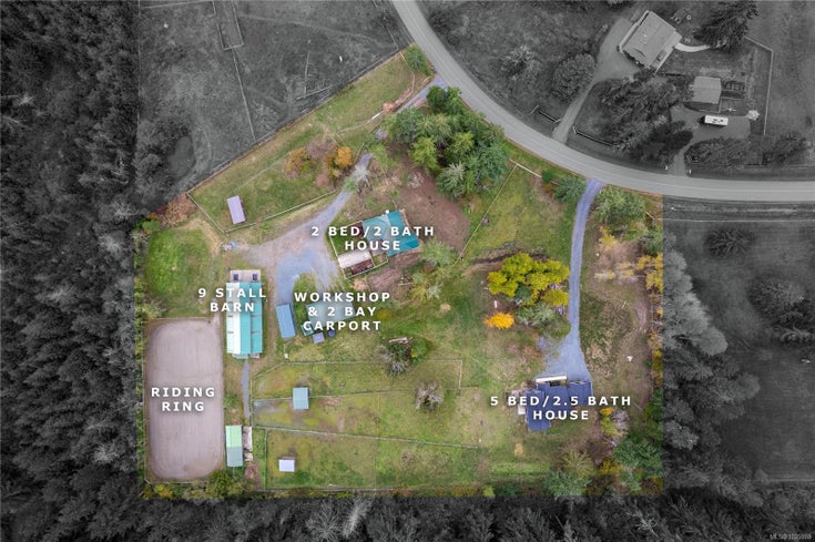 5-acre equestrian facility, with 2 homes, in the highly desirable Rocking Horse Loop neighbourhood in Nanoose Bay, ready for your equestrian dreams. Professionally engineered, well-ventilated barn with nine 12 x 12 rubber-matted stalls, heated wash b ...